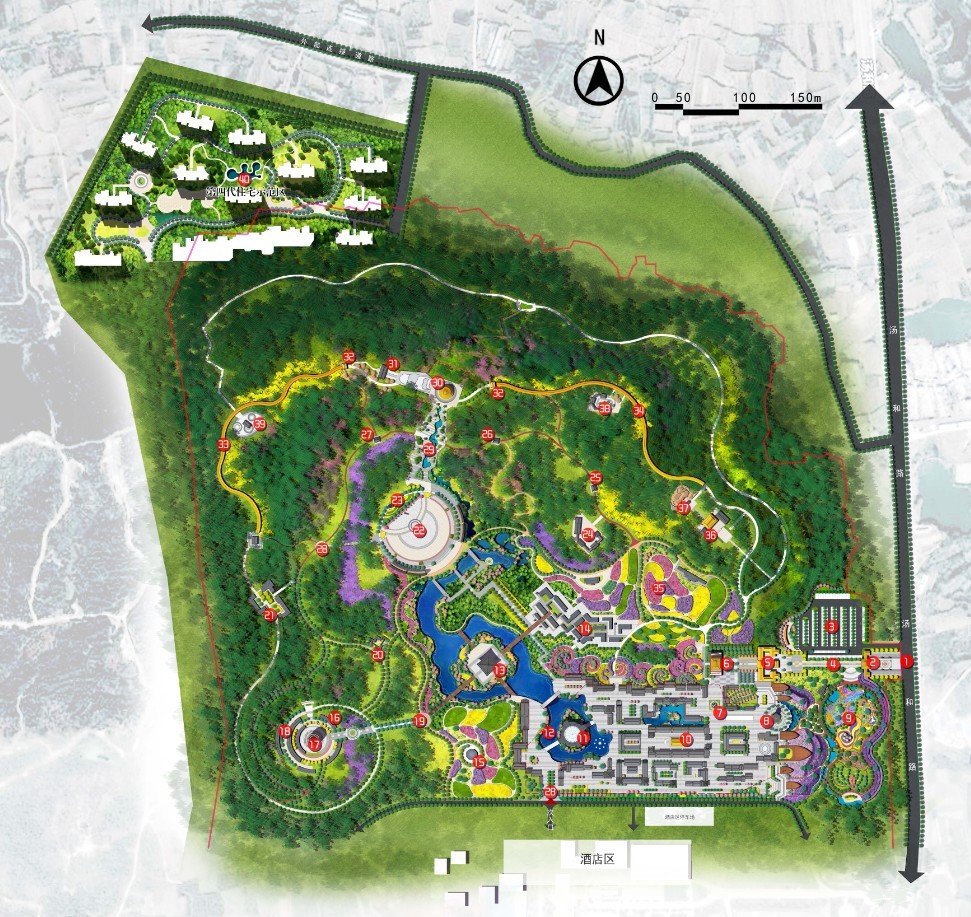 2、一脈西蘆山,傳承大明園;傳奇大明園,多彩龍興地。將整個區域規劃為“兩軸、兩環串六區”的總體結構。兩軸為文化演繹軸、文化體驗軸,兩環為內環核心景觀、外環大地景觀。