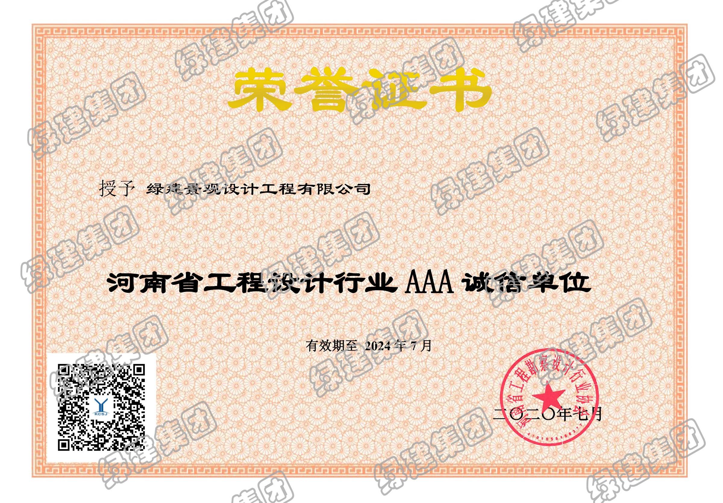 河南省工程設計行業AAA誠信單位