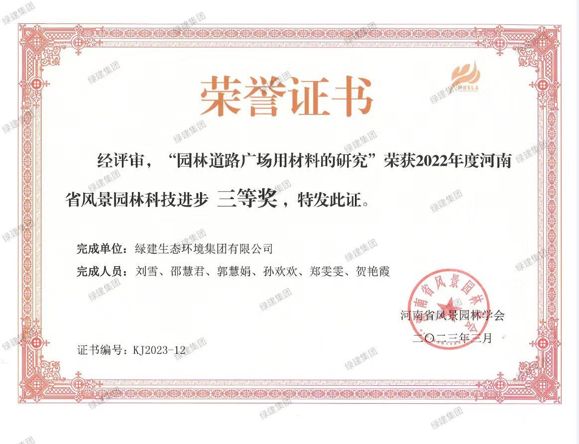 園林道路廣場(chǎng)用材料的研究榮獲2022年度河南省風(fēng)景園林科技進(jìn)步獎(jiǎng)三等獎(jiǎng)